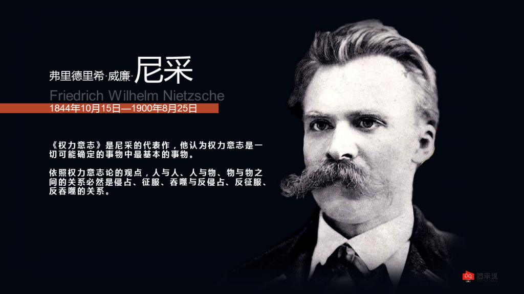 1844年10月15日—1900年8月25日《权力意志》是尼采的代表作,他认为权力意志是一切可能确定的事物中最基本的事物。