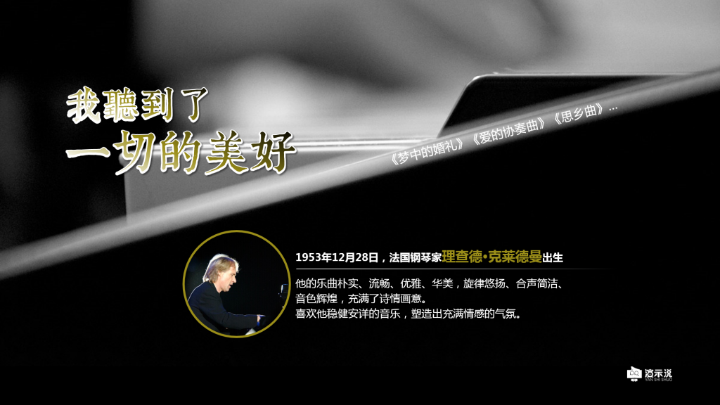 理查德·克莱德曼是我非常喜欢的钢琴家。主色调是“钢琴黑”,重点突出“我聽到了一切的美好”,用深黄色与白色过渡展再光影效果。人物缩放并进行环形裁切处理,再配以简单文案。
