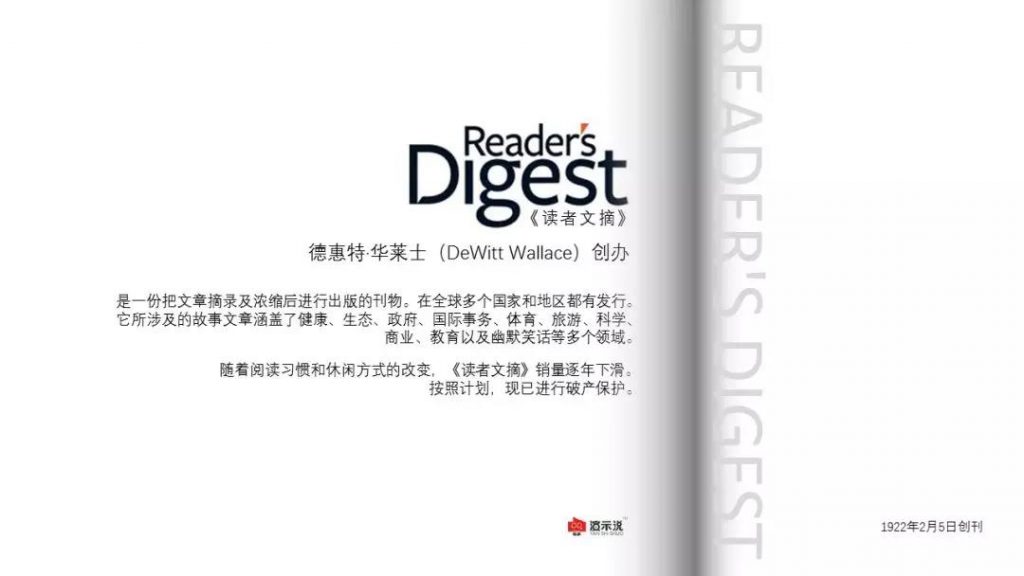 随着阅读习惯和休闲方式的改变,《读者文摘》销量逐年下滑。按照计划,现已进行破产保护。