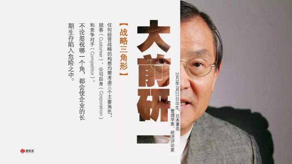 挑选了大前研一的经营理论作为PPT的内容,本张用了图文结合的排版,亮点是图与文相交错裁切,使得主题字与图片之间在不掉失信息完整性的同时提升了设计感;左侧的文字使用了竖排文字的方式保持了与主题字统一的格式。