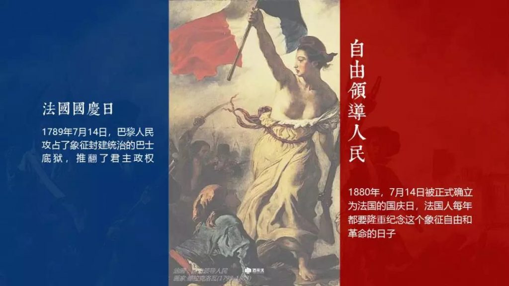 这张PPT巧用了法国国旗的三色旗,通过一幅名画“自由领导人民”,展开对法国大革命的介绍。