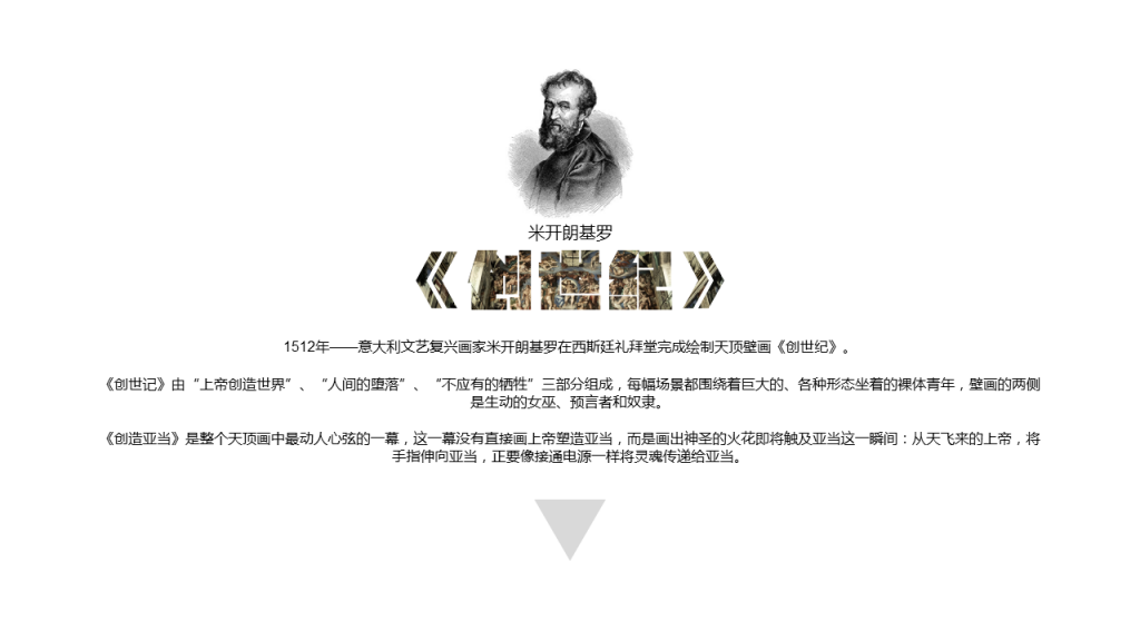 介绍一幅著名的画作,只需将它呈现出来即可,不建议在画作中添加任何设计元素,因此,我们另外做了一张用来展示主题及相关介绍。《创世纪》三字是画作整体预览图用巨粗字体“方正方魅简体”切割而成。