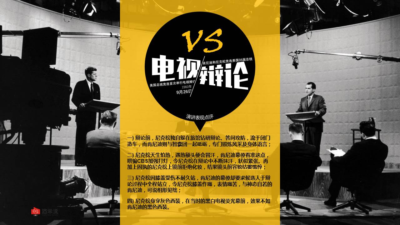 四) 尼克松身穿灰色西装,在当时的黑白电视荧光幕前,效果不如肯尼迪的黑色西装。